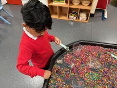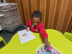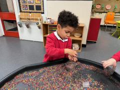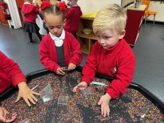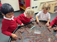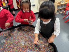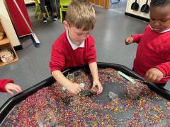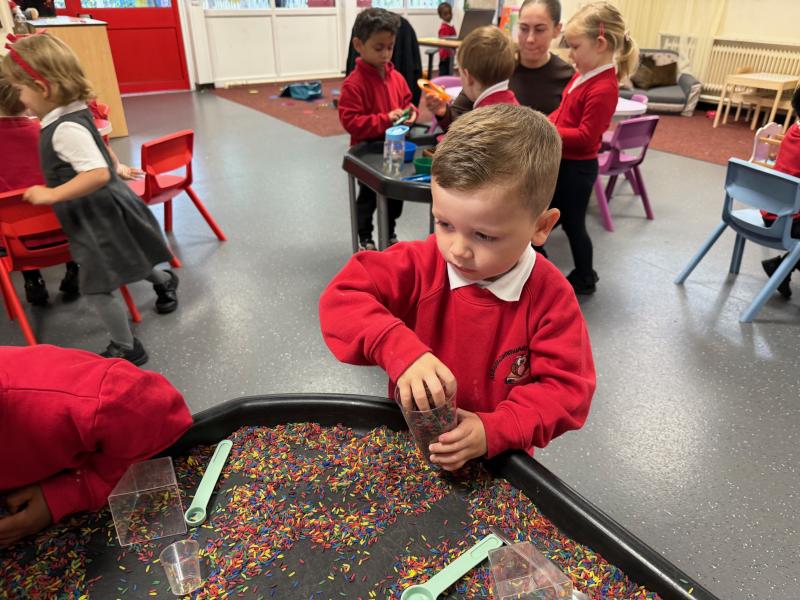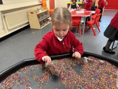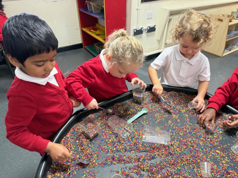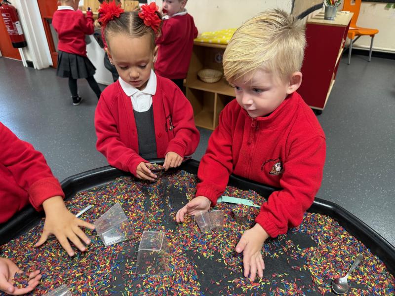 In our maths tray, the children have had lots of fun with our colourful rainbow rice tray. They enjoyed scooping, pouring and filling different-sized containers, practising their fine motor skills as they explored.