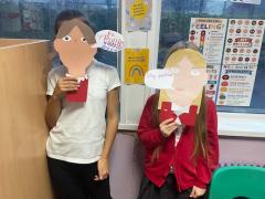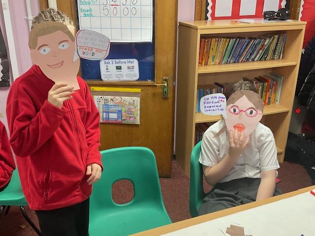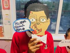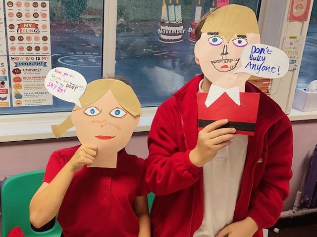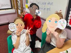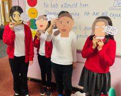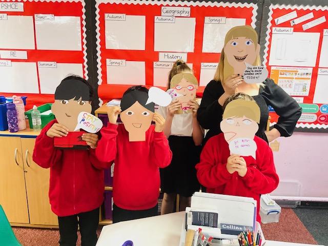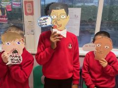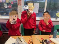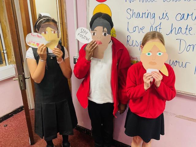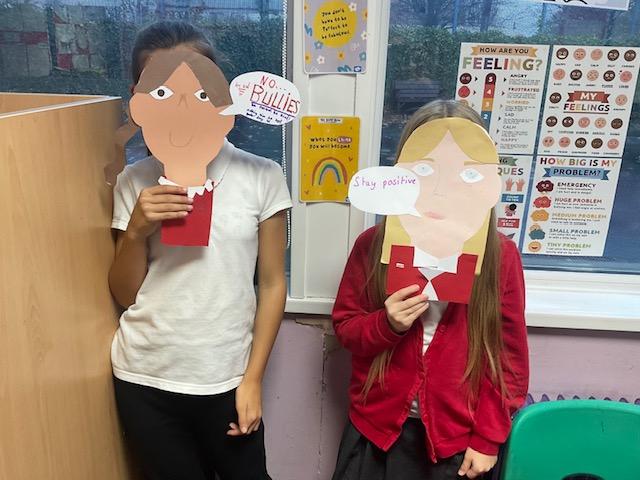 A community artist came to visit year 5 this week to create anti-bullying art. First, we created self-portraits using collage and then we added messages to reflect our responses to bullying. Can you recognise who is behind the mask?