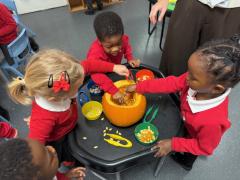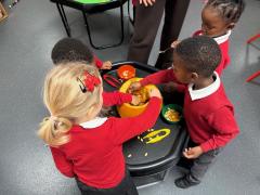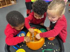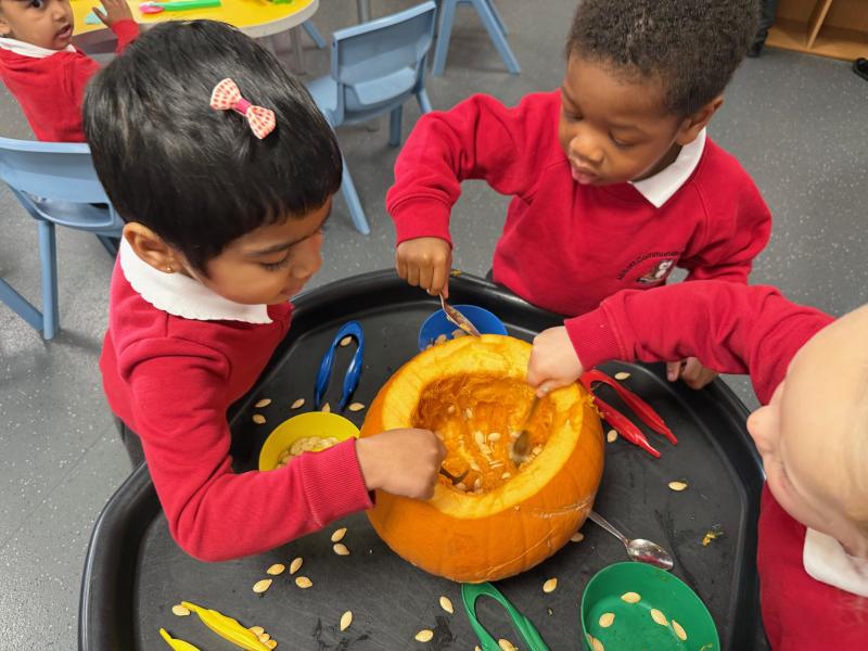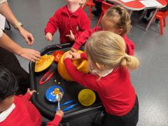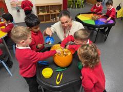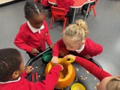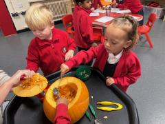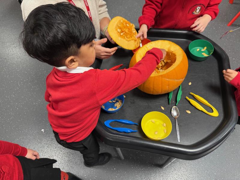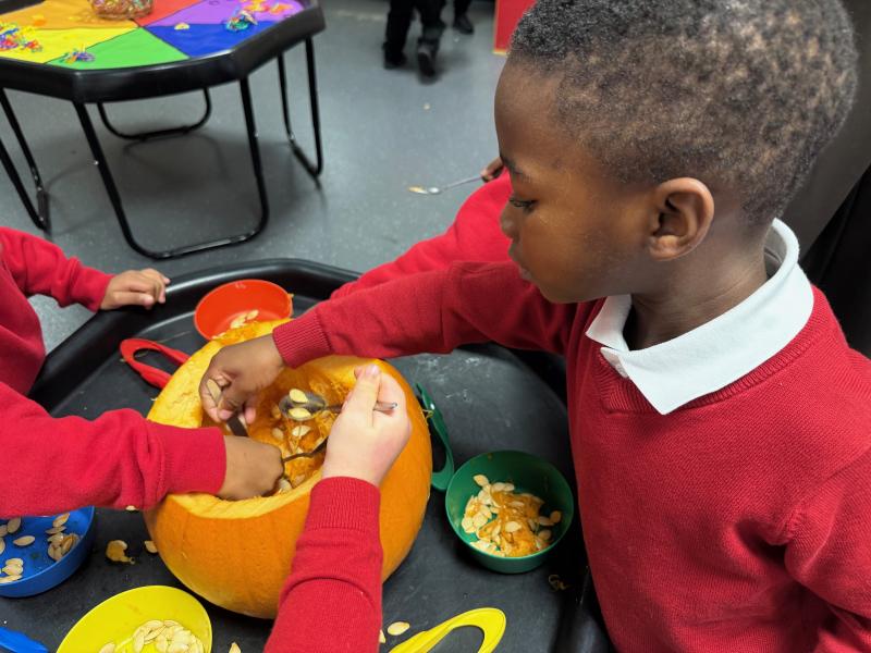What a wonderful week it has been in Nursery! We have been reading The Pumpkin Who Was Afraid of the Dark and the children have loved exploring real pumpkins using all their senses. They have enjoyed feeling the bumpy skin and carefully scooping out the insides. Using spoons and tweezers to collect the seeds gave them a great opportunity to practise their fine motor skills and they showed fantastic concentration throughout.