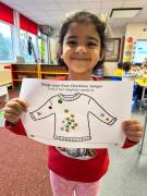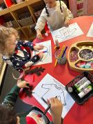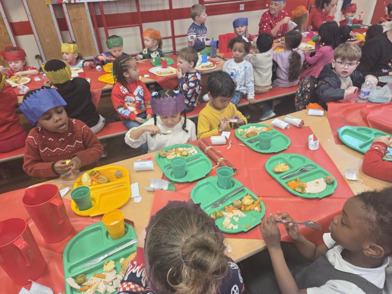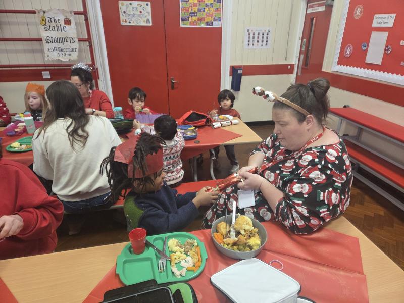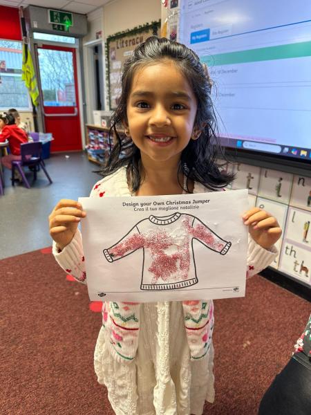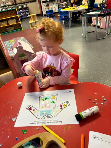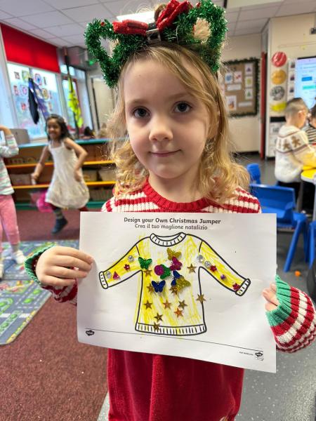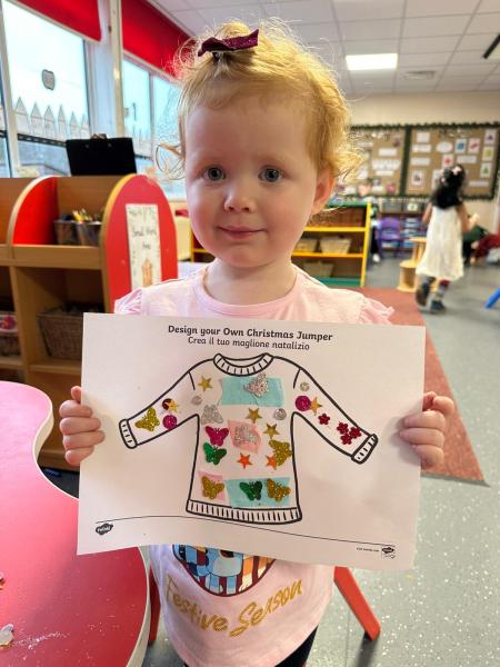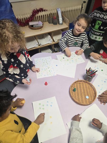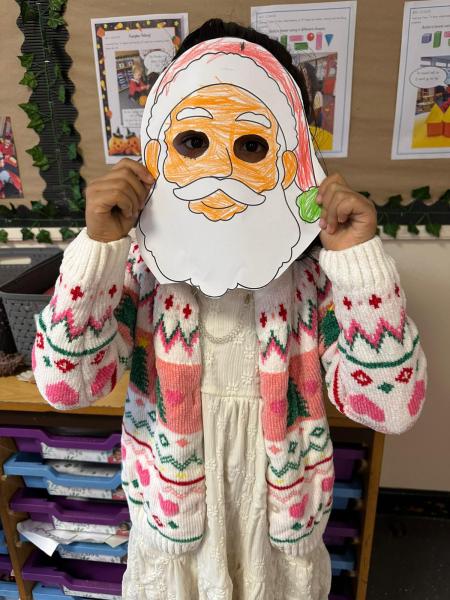 The children got very creative this week. We used Christmas-themed stampers, made festive masks, and decorated Christmas pictures. On Thursday, it was Christmas Jumper Day, and everyone came to school dressed in their festive outfits. It was also Christmas dinner day, and it was lovely to sit together, pull our Christmas crackers, and share our Christmas meal.